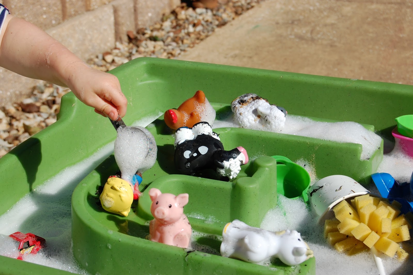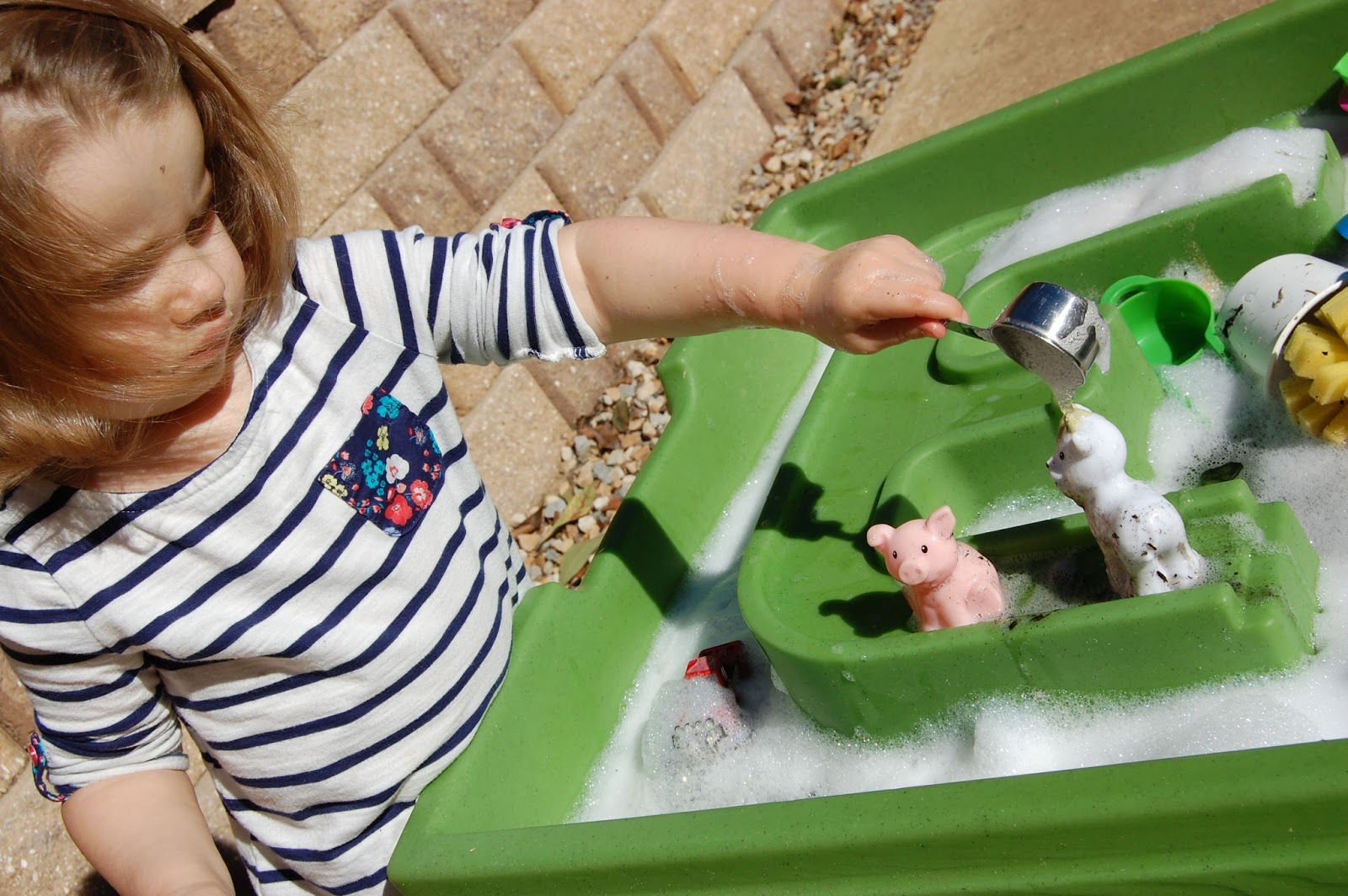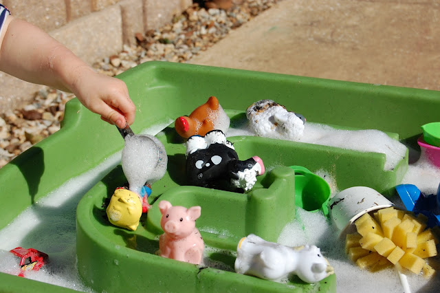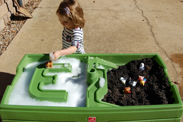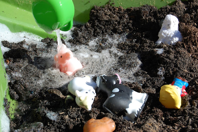 I whipped out our water table, shovel, and hose and took some dirt from our barren vegetable garden, and put it on one side, while adding bubbles to our water to make a nice bath for our dirty farm animals.
