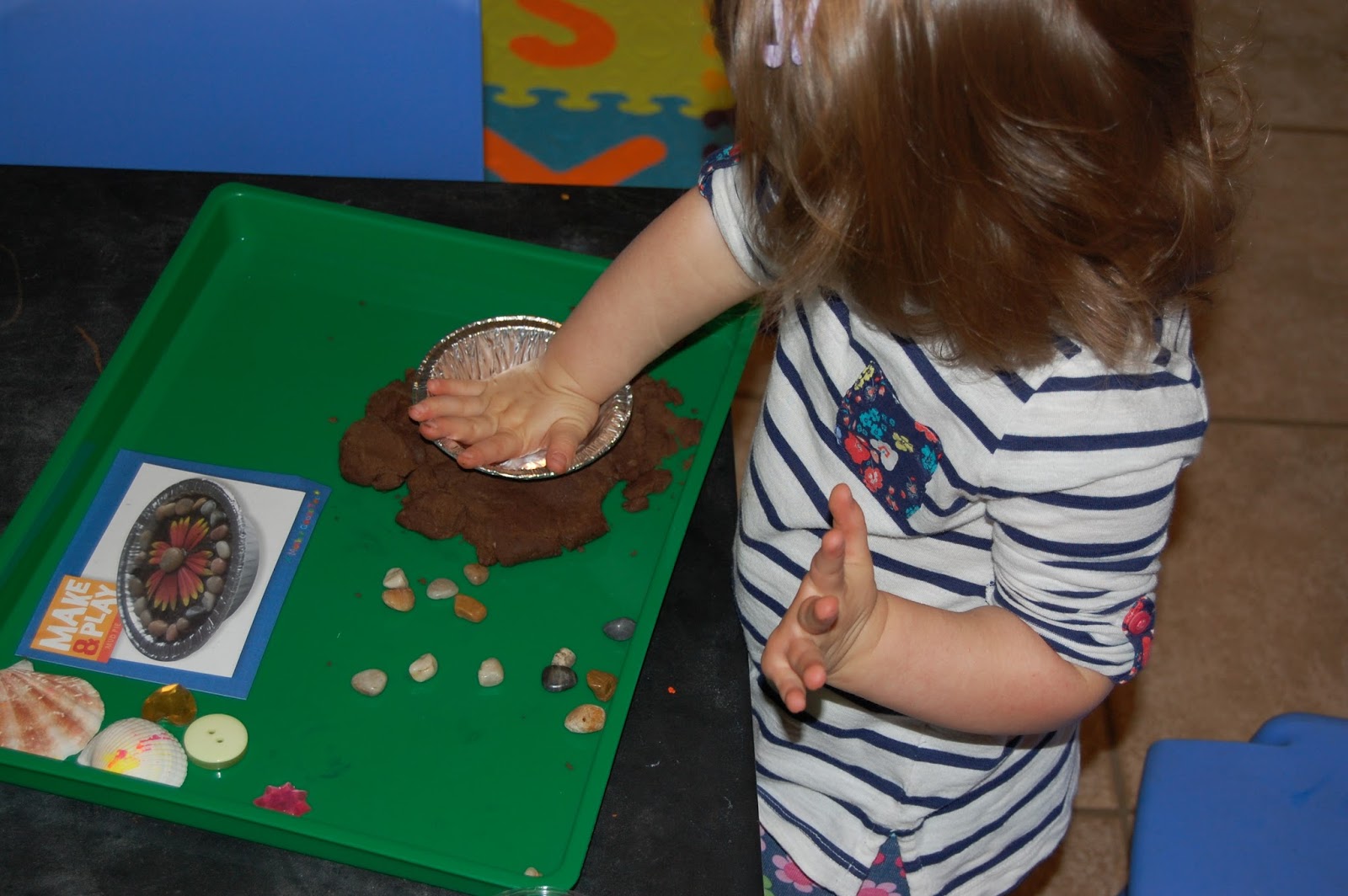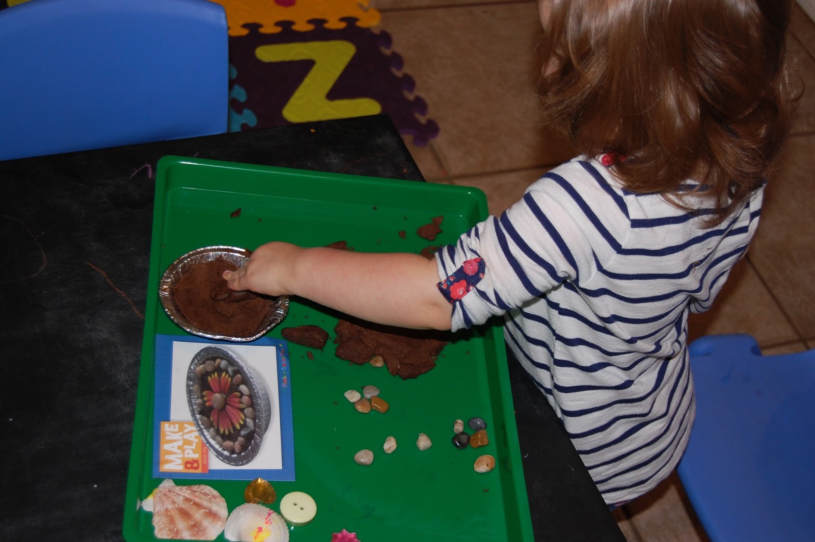Once the play dough was made, I set out her tray with the Make and Play Mud Pie picture, rocks, tin foil pie plate, (all of which were included in our kit), along with some of our own jewels, buttons and shells to imprint designs into the “mud.”