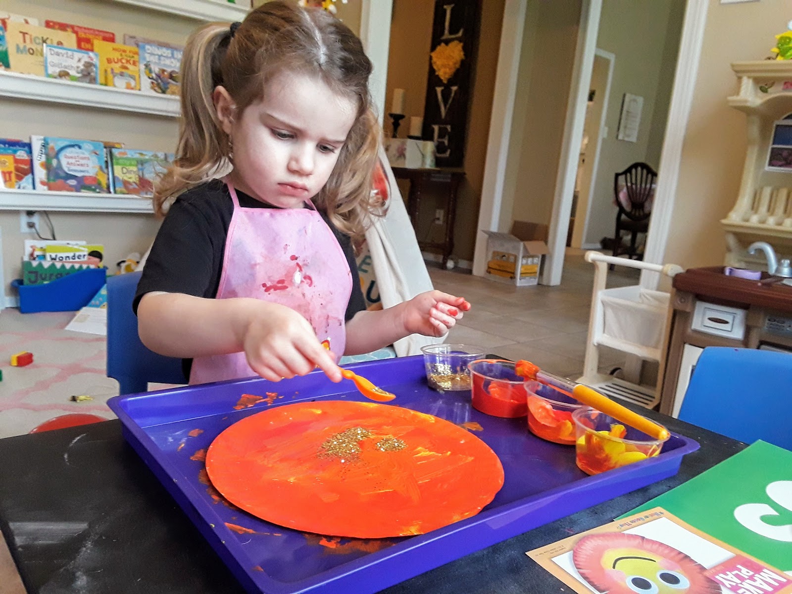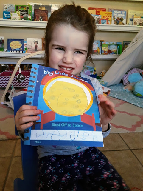 Afterwards, she worked on her My Little Journal cover. It suggested to place the moon on the cover. Avaleigh traced one of her play kitchen bowls. I asked her if she wanted to color it and of course she said yes. I was most surprised when she started drawing the moon’s craters by drawing blue circles all over her moon. I didn’t suggest it at all.